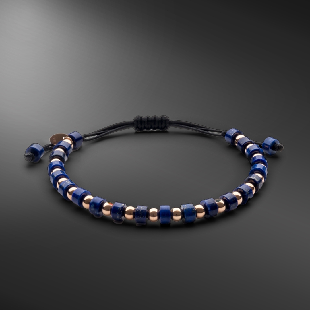 Men's bracelet from Jaibor, part of the Wolf Small collection, crafted with natural Lapis Lazuli stone, 18-karat red gold, and nautical Macrame cord.