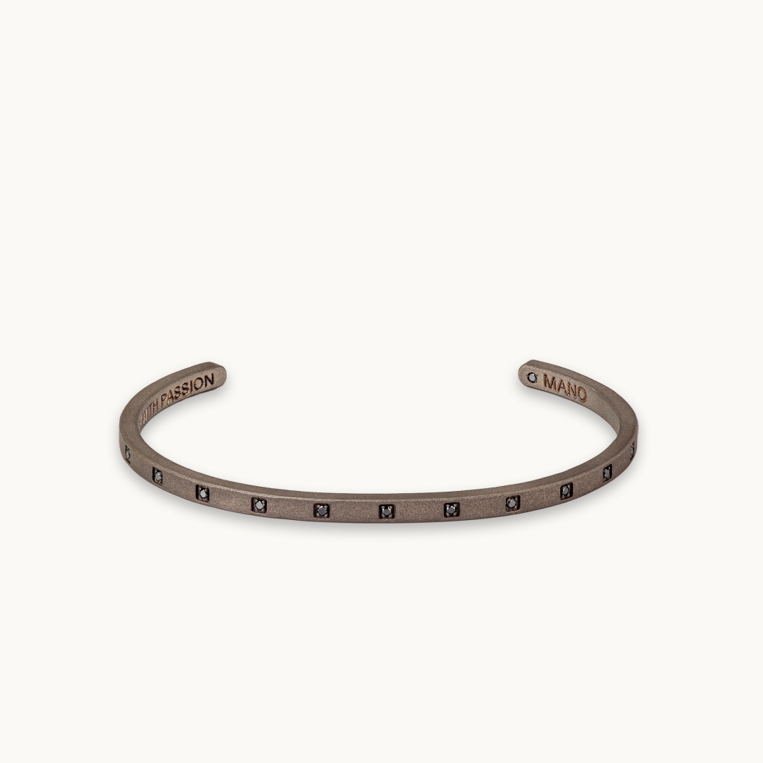 Byzylyk Titani pjesë e koleksionit Minimal Schiava, punuar në mënyrë artizanale në Titanium me finiturë Brush. Montuar me 0.17ct Diamantë të Zinj në formë Brilante. Përfshin një strukturë solide Titaniumi çka i jep fortësinë dhe qëndrueshmërinë karakteristike. Byzylykët e Mano J. gjithashtu kanë të montuar një Diamant të Zi 0.01ct si veçori identifikuese e brandit.