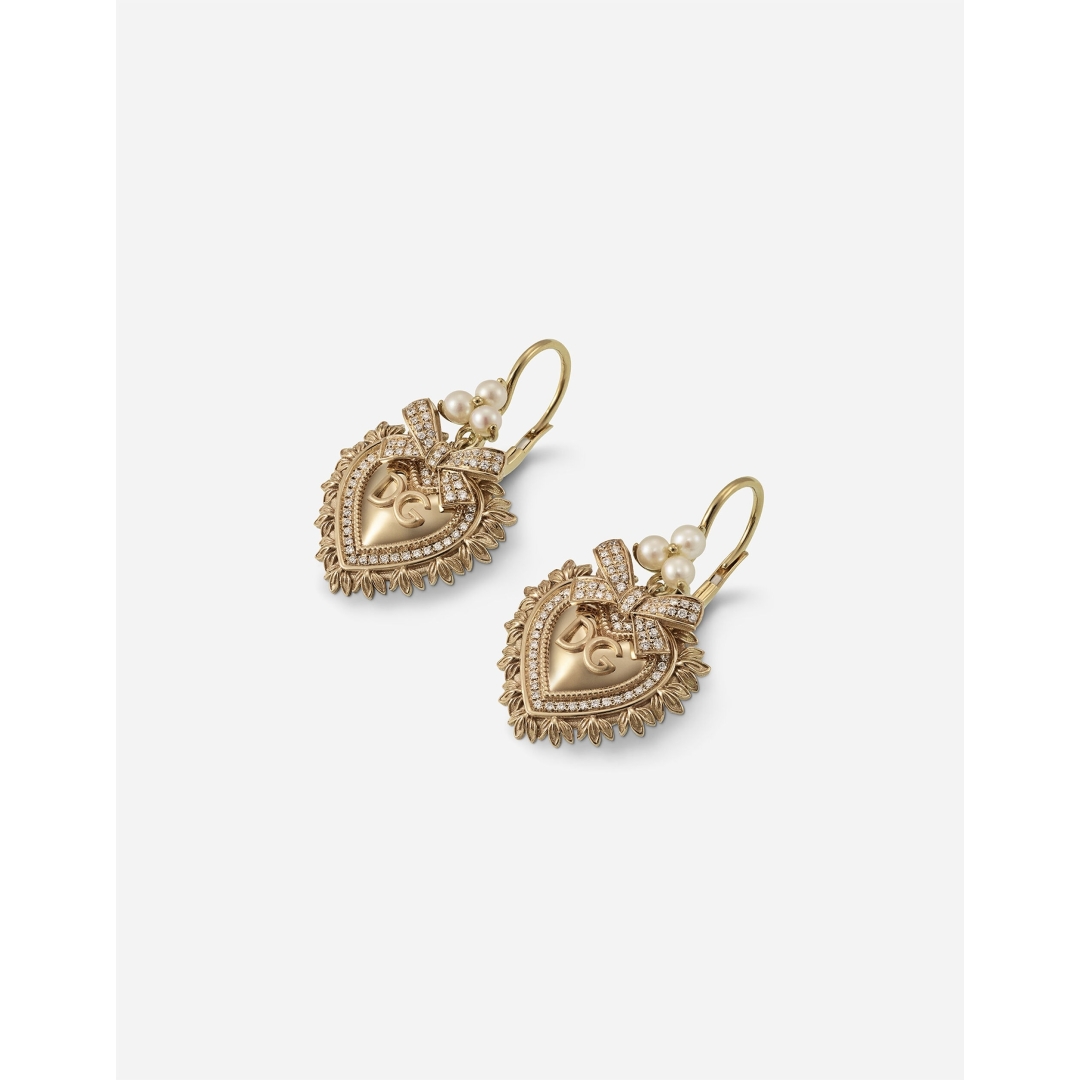 The 18 kt yellow gold hoop earrings consist of three elements that elegantly follow one another from top to bottom in the following order: a clover of spherical pearls, a lovely bow of colorless diamond pavé, a wonderful sacred heart, symbol of unconditional love, framed by a pavé of diamonds. Inside the sacred heart is engraved the DG logo.