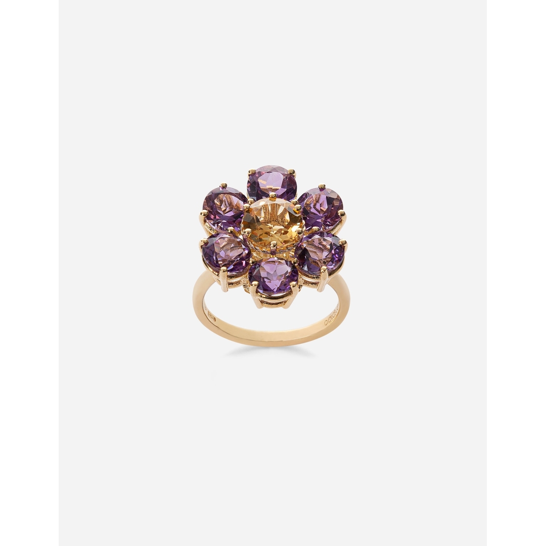 Unazë në formë luleje me petale të punuara nga gjashtë ametistë të rrumbullakët dhe një citrin i rrumbullakët në qendër. Gurët janë të vendosur në korniza të çmuara prej floriri të verdhë, të punuara me tel të përdredhur dhe të zbukuruara me motive lulesh. Brenda unazës është gdhendur logoja DOLCE&GABBANA.