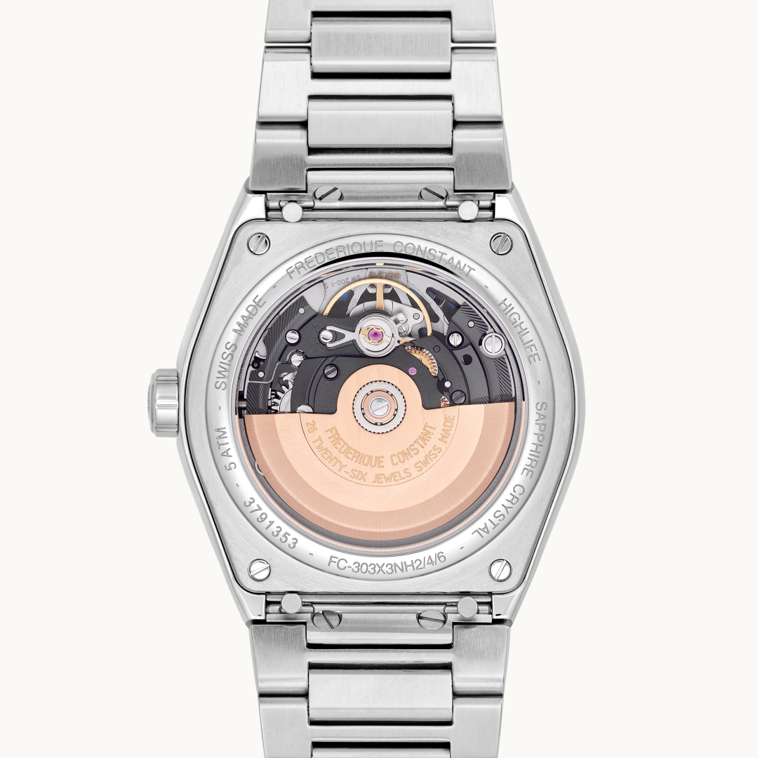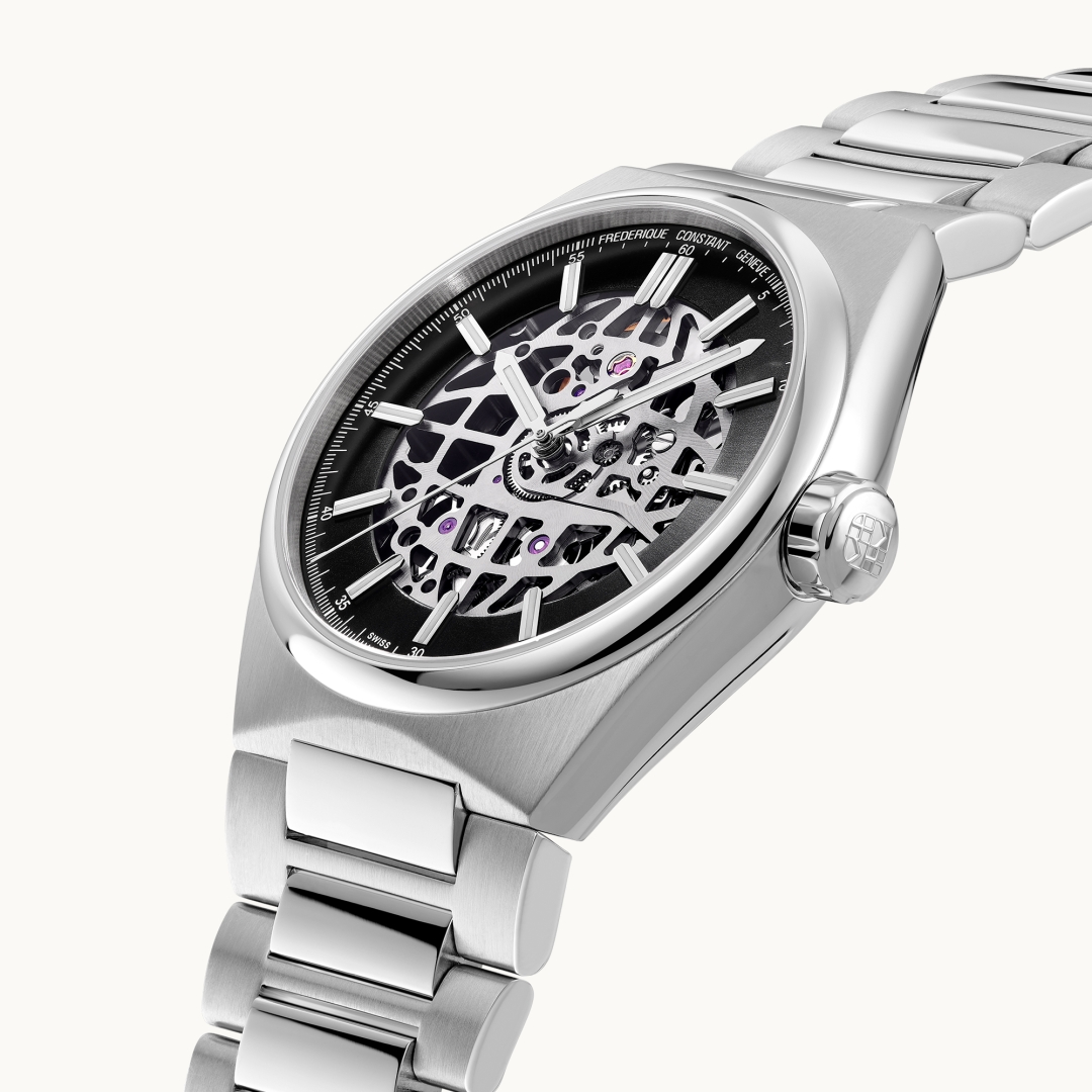 The Highlife Automatic Skeleton lets you journey to the centre of the Earth A TWOFOLD CHALLENGE This skeleton work presents a technical and aesthetic challenge. Technical, as the calibre is updated through tiny openings as numerous as they are delicate and created without the use of any sharp angles, in keeping with the curvature and harmony of the Earth. MECHANICAL BALLET The highly original cut-out of the Earth at its centre reveals the beating heart of the movement: at 12 o’clock, the balance wheel; between 5 o’clock and 6 o’clock, the barrel, wound by the winding stem found at 3 o’clock. The openwork Earth allows you to see something, but not everything. DESIGN The Highlife Gents models have a 41 mm case, available in various materials. The lack of horns allows for greater flexibility and helps the watch sit naturally on the wrist. The integrated design is infinitely more complicated to conceive than any strap with horns. The process requires perfect continuity between the lines of the case and the links, a smooth, regular but gradual transition to the clasp and natural fluidity that should be almost imperceptible. DISTINCTIVE QUALITIES The Highlife collection is based on certain fundamentals acquired from Frederique Constant’s lengthy experience, which have been revised and improved: a new case design, interchangeable straps and a delicate globe decoration on the dial that can be admired down to the smallest detail thanks to the sapphire crystal, which benefits from an anti-reflective treatment on both sides. Distinctive qualities common to all the models help propel the Highlife towards new horizons. Highlights Functions - Hours, Minutes, Seconds Type of movement - Automatic Movement REFERENCE - FC-310 HALF SKELETON Type of movement - Automatic Power reserve (hours) - 38h Vibrations per hour - 28'800 alt/h Jewels - 26 Case Material - Titanium coated Stainless steel Diameter or dimensions (mm) - 39 Thickness (mm) - 10.34 Lug width (mm) - 24 Water-resistance (ATM) - 5 Dial Colour - Grey Finishing - Sunray Indexes - Applied indexes
