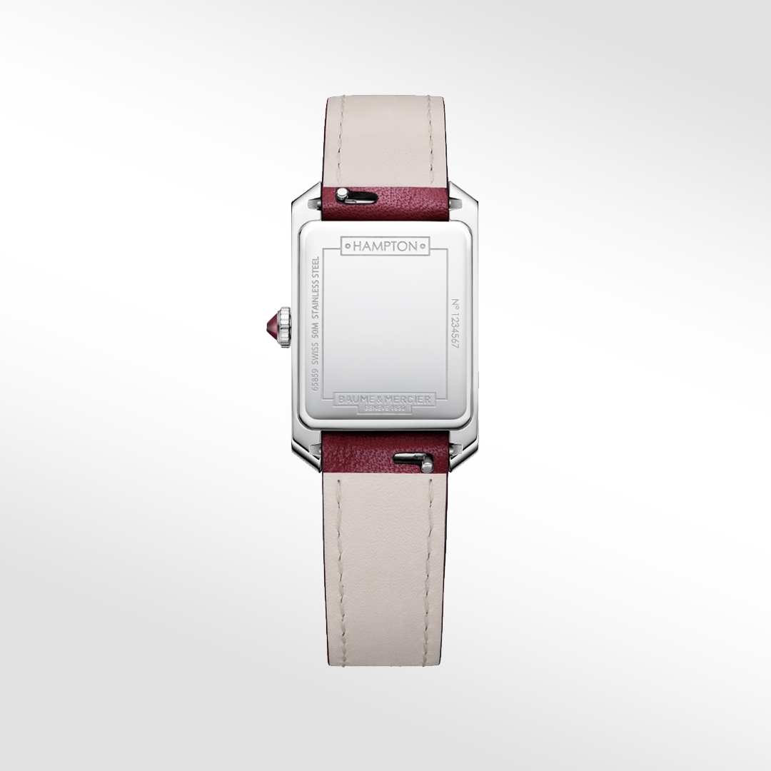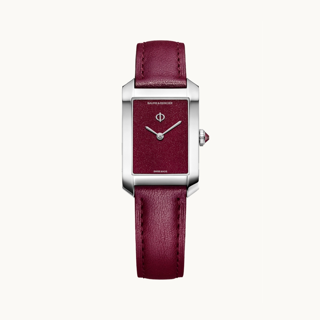 QUARTZ WATCH - 35X22MM The Hampton 10673 plays on a harmonious combination of color and material. This rectangle timepiece in polished stainless stee features a burgundy dial paired with a sparkling burgundy calfskin strap for a monochrome and elegant touch. Description The two new Hampton models (10673 & 10674) are the worthy heirs of this approach, with their slim, well-balanced 35 x 22.2 cm cases that are 6.9 mm thick. The case is protected by a domed scratch-resistant sapphire crystal and houses a new-generation quartz movement with eight years of autonomy, indicating the hours and minutes. Both are covered with a delicately glittering varnish inspired by aventurine gemstones and star rubies, creating a sparkling effect that exalts the femininity of these elegant watches. The quest for a streamlined design, a signature of Baume & Mercier timepieces, is reflected in the minimalist presence of two “glaive” hands and an elegant Phi, the company’s logo, as an appliqué at 12 o’clock. Case Shape - Rectangular Size Diameter - Width: 22.2 mm x Length: 34.9 mm Thickness - 6.92 mm Material And Finishes - Steel, Polished Bezel - Non-rotating bezel Case Back - Full case back, With screw Colours and Finishes - Purple, Spangled, None Hands - Grey, Swords, None