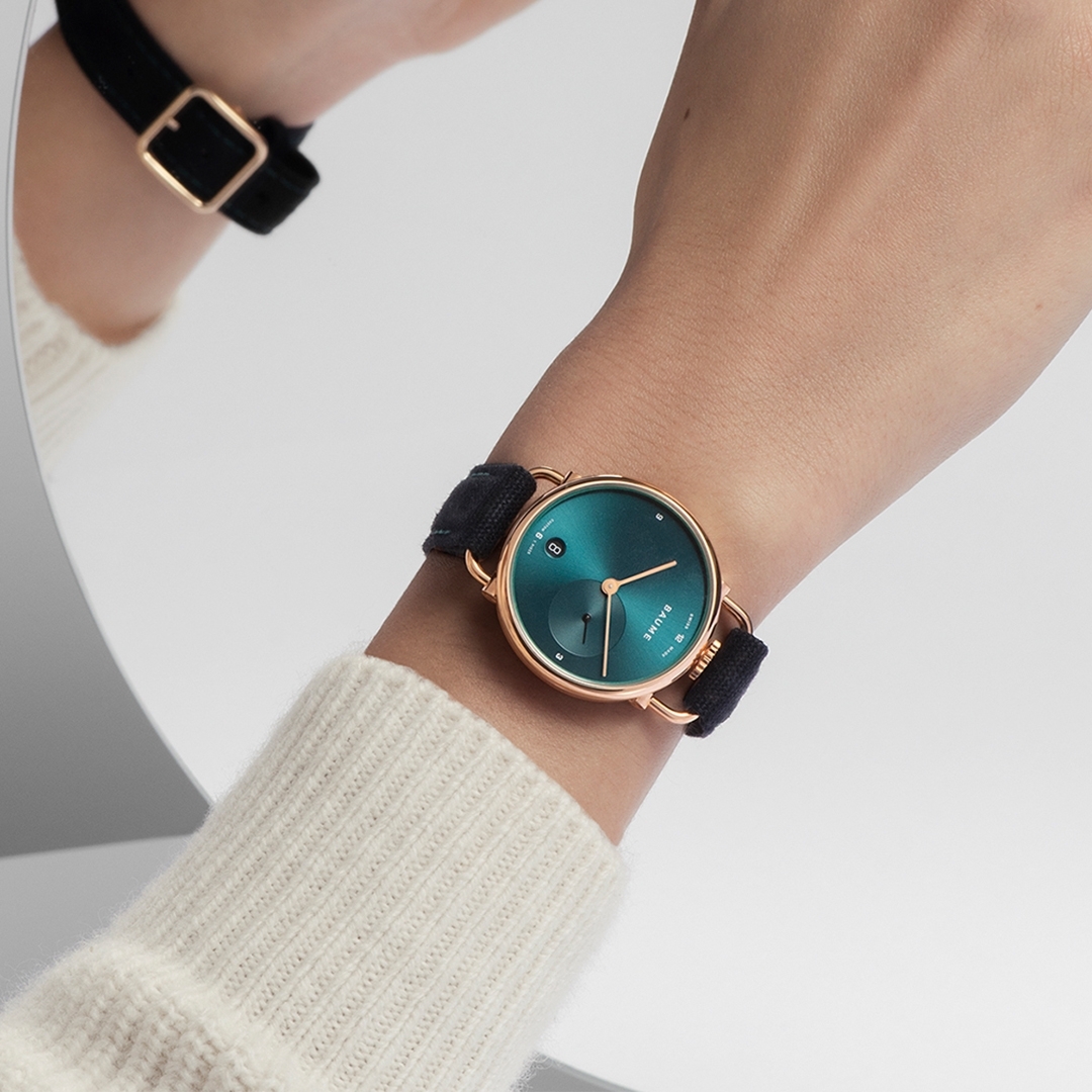 QUARTZ WATCH, DATE DISPLAY - 35MM This BAUME watch is a round timepiece in gold PVD with a crown at 12 o’clock, mobile horns and a interchangeable strap system. It features a sun satin-finished green dial and a strap in coton with green overstitching and lined in cork for more comfort. Description The BAUME collection offers a range of timepieces equipped with a colored flange in the same color as the small seconds hand and the overstitching on the strap. Blue, red, violet, green or black, each BAUME watch offers a color combination that makes it unique! All the straps are crafted in natural materials and are interchangeable thanks to our recycled button system, and each one is lined with cork for absolute comfort in wear. As a fun accent, even the color of the thread on the button coordinates with the color of the watch! Energy - Quartz Number of Rubies - 5 Case Shape - Round Shape - Round Size - Diameter: 35mm Thickness - 7.56 mm Material And Finishes - Gilded PVD steel, Poli Case Back - Full case back, With screw Colours and Finishes - Green, Satiné, Sunray Hands - Yellow, Bâton