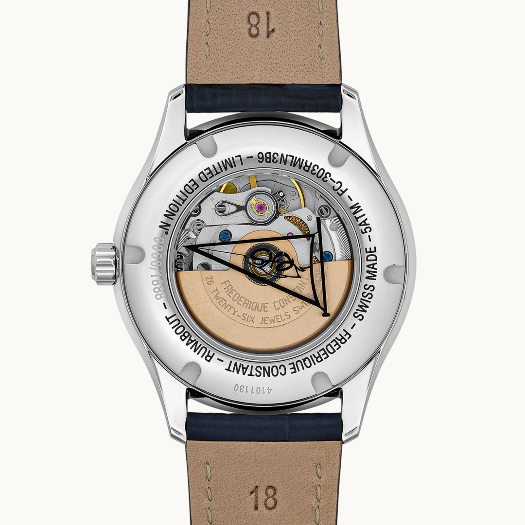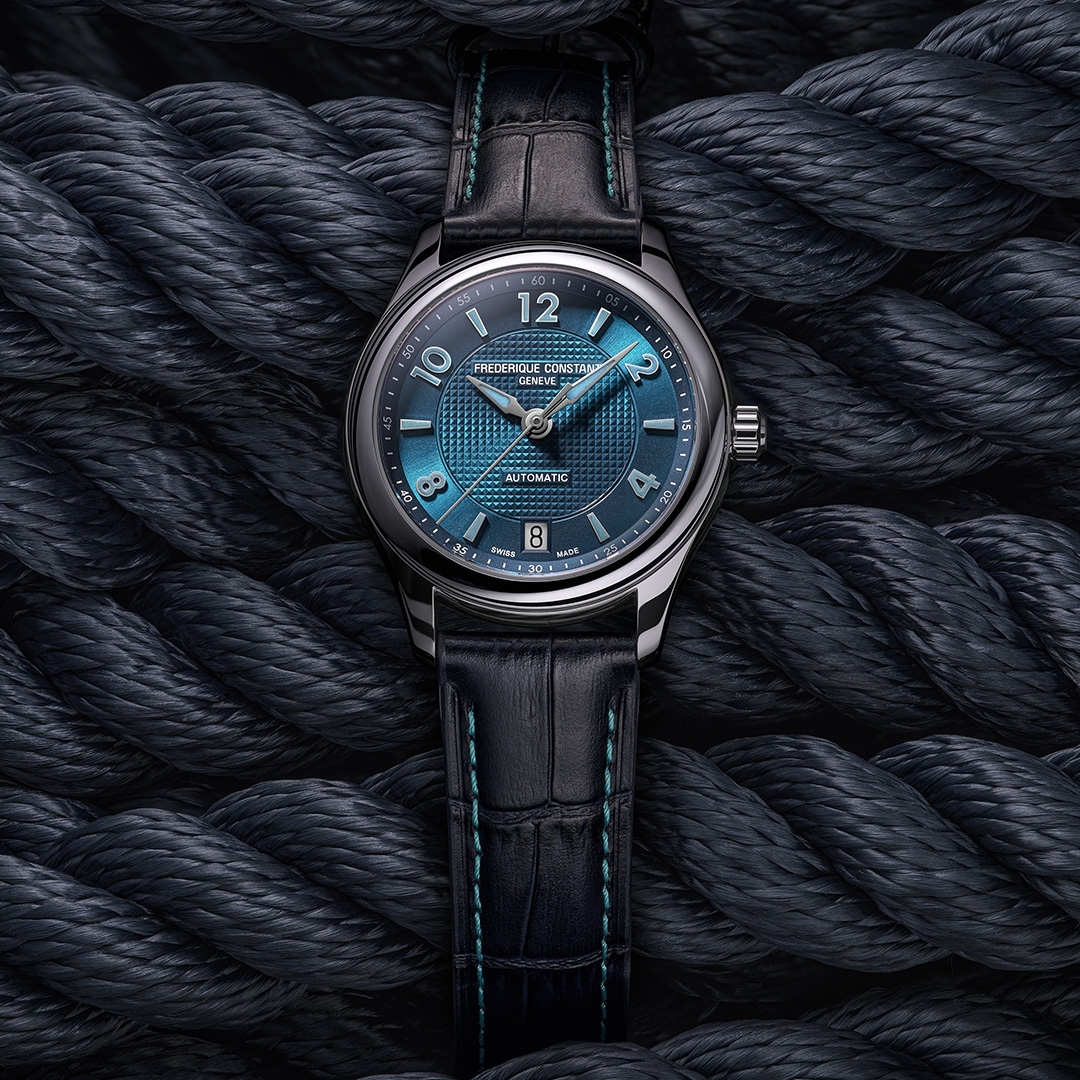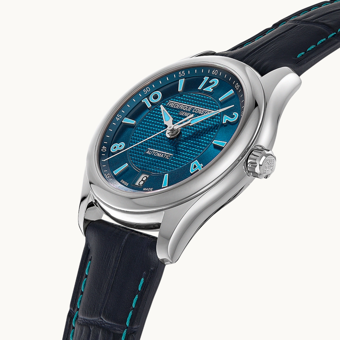 For the first time, the collection now features a piece in a bright, contemporary electric blue, as bracing as a breaker and as refreshing as a trip out to sea. As well as cladding the dial, hands and hour markers, the all-new colour extends to the topstitching on the calfskin strap. The new version comes in 36-millimetre formats, with just 1,888 of each being produced. Limited Edition - 1888 pieces Additional information Functions - Hours, Minutes, Seconds, Date at 6 o'clock Type of movement - Automatic Movement REFERENCE - FC-303 Type of movement - Automatic Power reserve (hours) - 38h Vibrations per hour - 28'800 alt/h Jewels - 26 Case Material - Stainless steel Colour - Stainless steel Diameter or dimensions (mm) - 36 Thickness (mm) - 9.85 Lug width (mm) - 18 Water-resistance (ATM) - 5 Dial Finishing - Sunray & clous de paris guilloché Indexes - Applied arabic numerals 2/4/8/10/12 & applied indexes 1/3/5/6/7/9/11