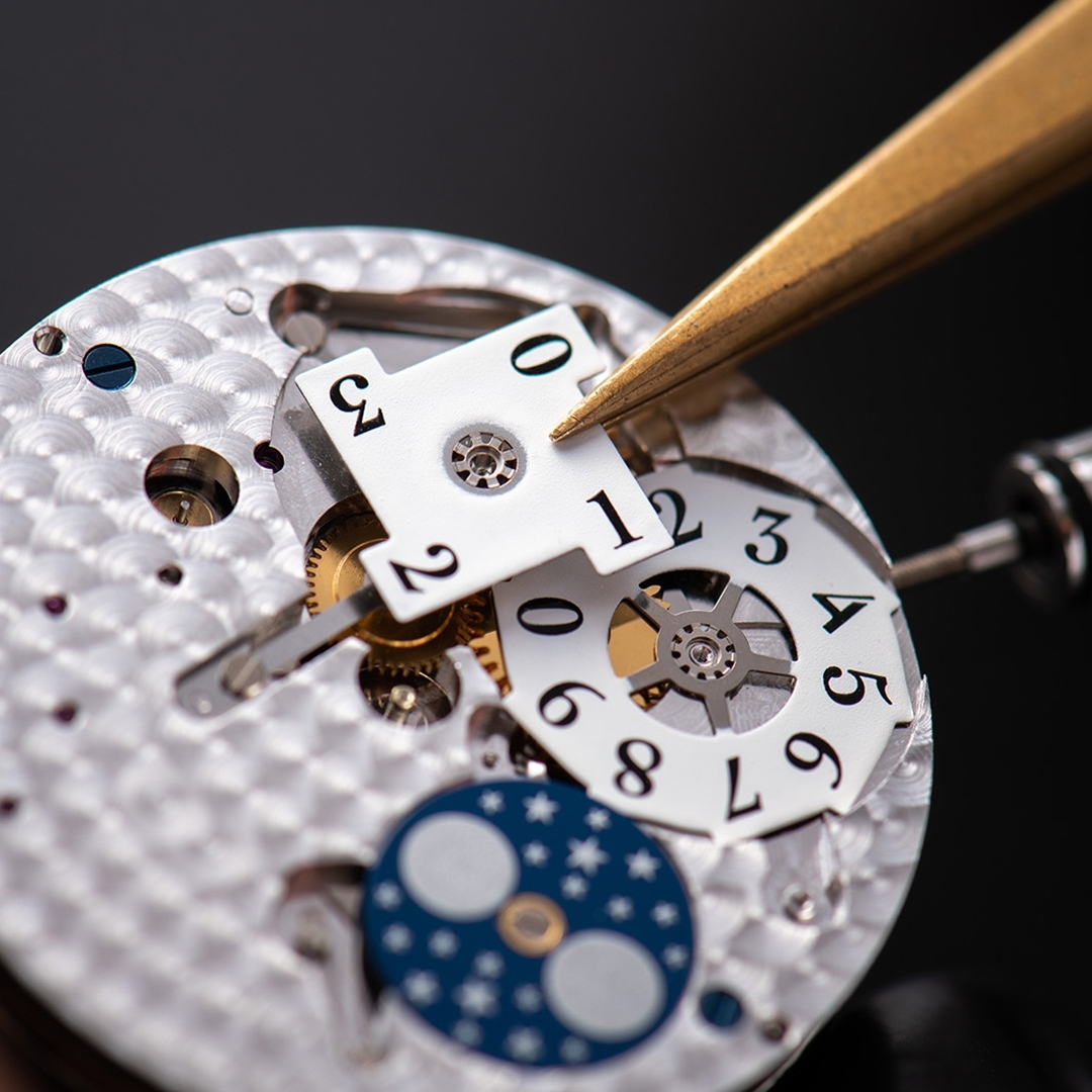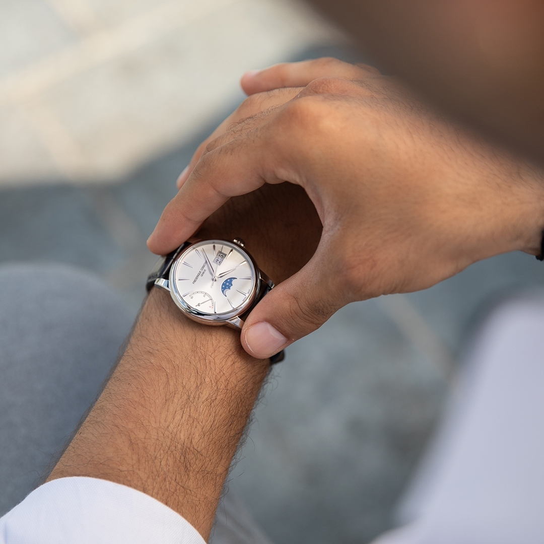 The Classic Power Reserve Big Date Manufacture is housed in a 40mm case and is equipped with the FC-735 Manufacture caliber that boasts three complications: power reserve, big date and moonphase. BIG DATE The Classic Power Reserve Big Date Manufacture, bringing to life Frederique Constant’s thirty-first Manufacture calibre, the FC-735. It’s the first calibre from the firm to offer a big date, a moon phase and a power reserve indicator – now for a total of 50 hours., The latter is indicated at 9 o’clock by a slim, dedicated hand travelling along an arc marked out from 0 to 50, ending in a red zone warning that it’s time to wind the watch before it stops. Opposite, between 2 and 3 o’clock, the big date proudly displays its encircled double window (one for tens and the other for units). This perfect balance is further highlighted by a radiant, poetic moon phase at 6 o’clock on a starry blue background. Additional information Highlights Functions - Hours, minutes, seconds, big date, power reserve indication, moonphase Type of movement - Manufacture Movement REFERENCE - FC-735 Type of movement - Automatic Power reserve (hours) - 50h Vibrations per hour - 28'800 alt/h Jewels - 32 Case Material - Stainless steel Colour - Stainless steel Diameter or dimensions (mm) - 40 Thickness (mm) - 12.19 Lug width (mm) - 20 Water-resistance (ATM) - 5 Dial Colour - Silver colour Finishing - Sunray Indexes - Applied diamond cut indexes 1/2/3/4/8/9/10/11/12