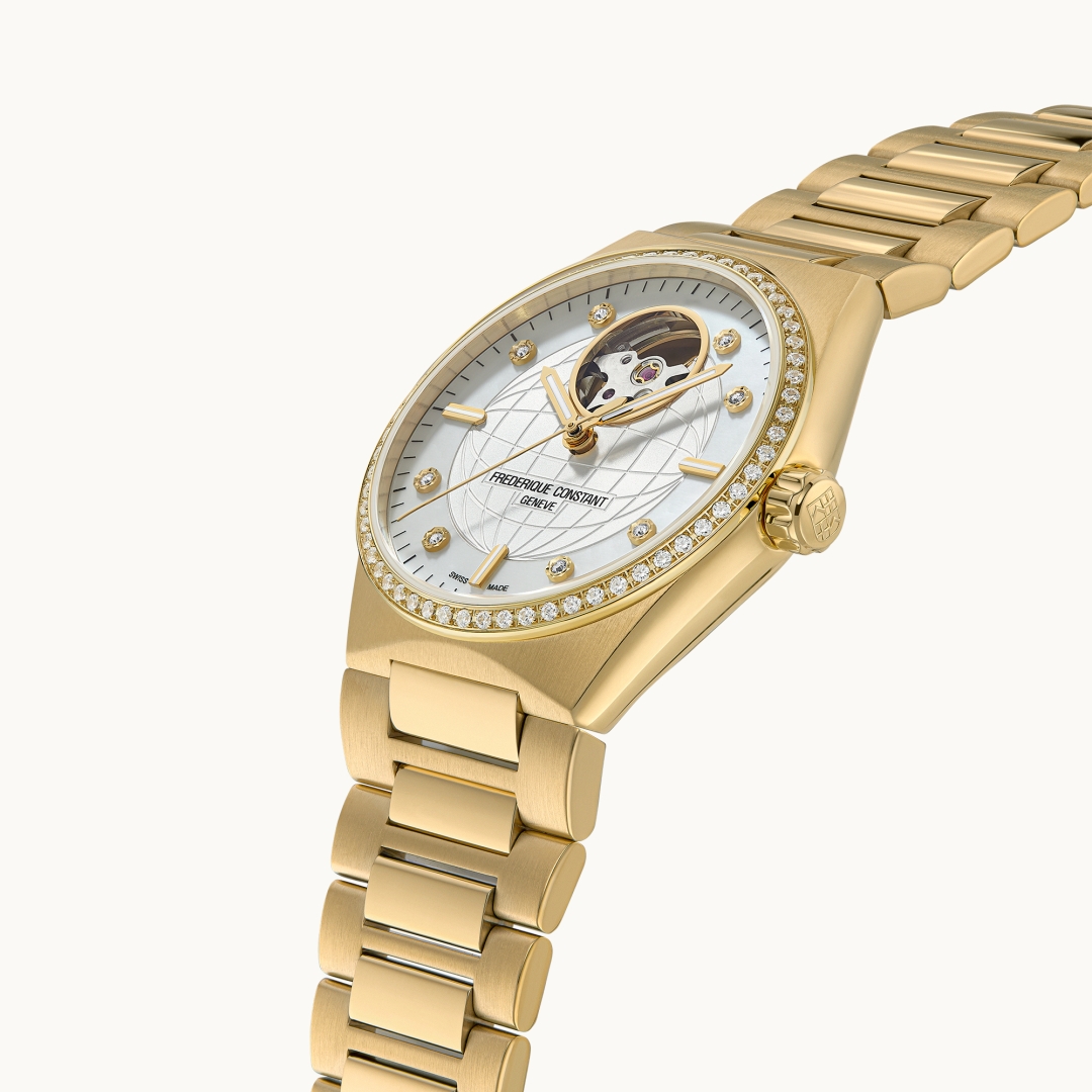 The Highlife Ladies Automatic Heart Beat line revisits the Maison’s iconic design revealing the inner workings of the movement, and brings it into the 21st century with an understated and minimalist design, as modern and unique as ever. The Highlife Ladies Automatic Heart Beat line revisits the Maison’s iconic design revealing the inner workings of the movement, and brings it into the 21st century with an understated and minimalist design, as modern and unique as ever. ICONIC HEART BEAT APERTURE The Highlife Ladies Automatic Heart Beat models capture the legacy of the Manufacture and carry it toward new creative horizons. At 12 o’clock, the pieces proudly display the window on their mechanical heart, made famous by Frederique Constant. Known as the “Heart Beat”, it lets you see the beating heart of the watch, its mechanical movement. It also reveals some essential components of Swiss Made precision. Highlights Functions - Hours, Minutes, Seconds, Heart Beat at 12 o'clock Type of movement - Automatic Movement REFERENCE - FC-310 Power reserve (hours) - 38h Vibrations per hour - 28'800 alt/h Jewels - 26 Case Material - Stainless steel Colour - Yellow gold Diameter or dimensions (mm) - 34 Thickness (mm) - 9.8 Lug width (mm) - 21.50 Water-resistance (ATM) - 5 Number of diamond - 60 Number of carat - 0.45 Dial Colour - Silver & white Finishing - Sunray with globe pattern embossed in the center & mop on outer ring Indexes - Applied indexes at 3/6/9 o'clock & diamonds at 1/2/4/5/7/8/10/11 o'clock Number of diamond - 8 Number of carat - 0.04