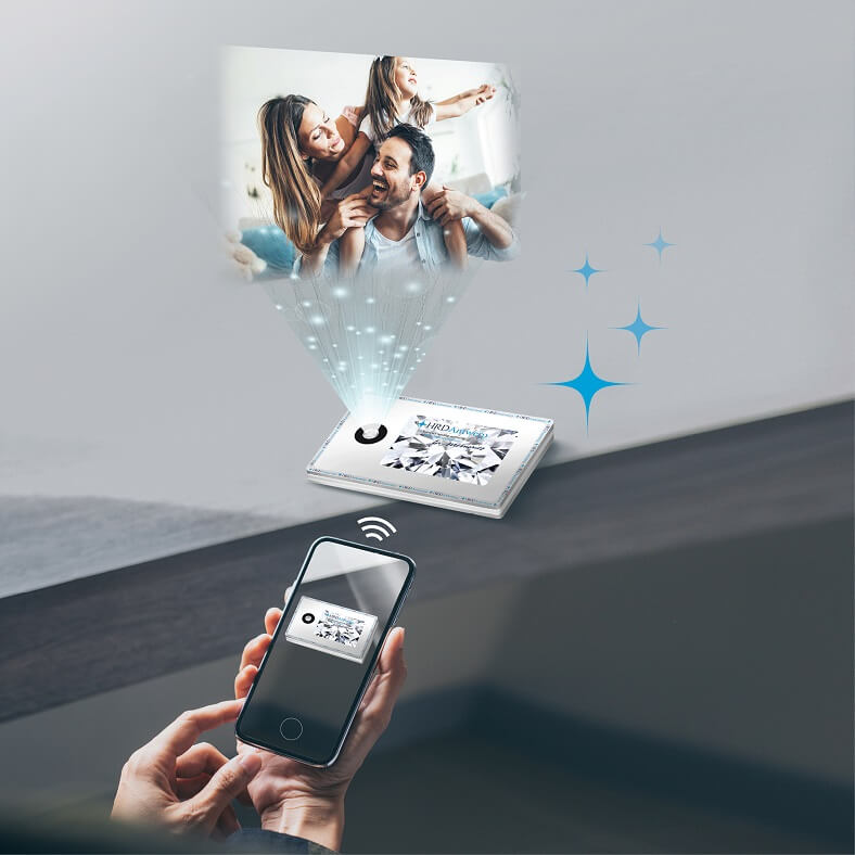 Do të shfaqet një pamje Live e kamerës së telefonit tuaj dhe nga diamanti I blisterit do të prezantohet në mënyrë virtuale si hologram videomesazhi juaj.