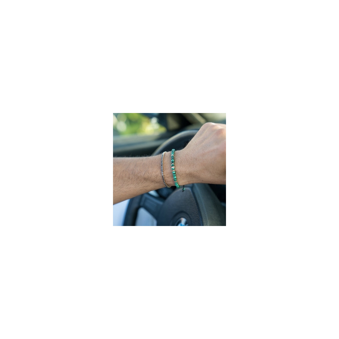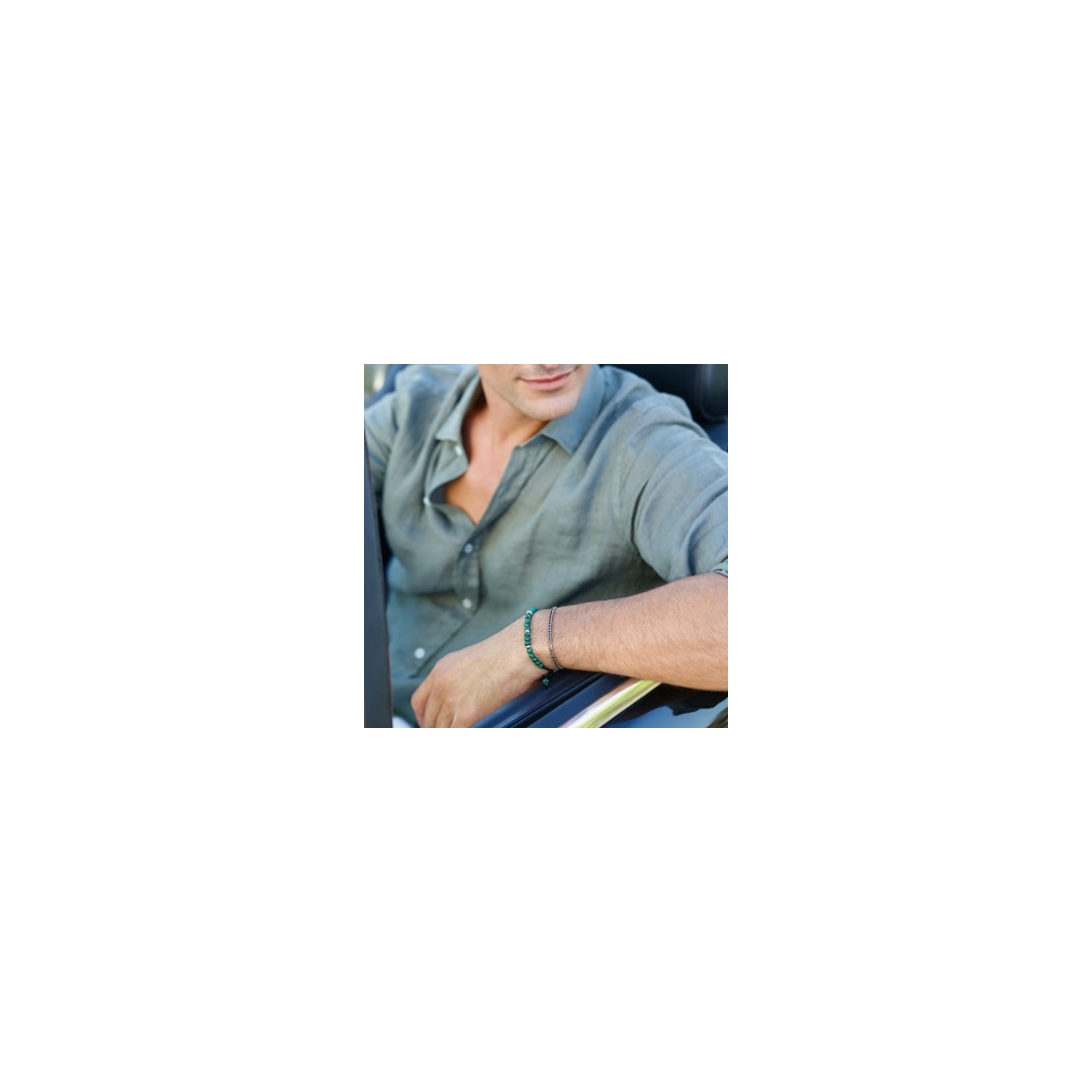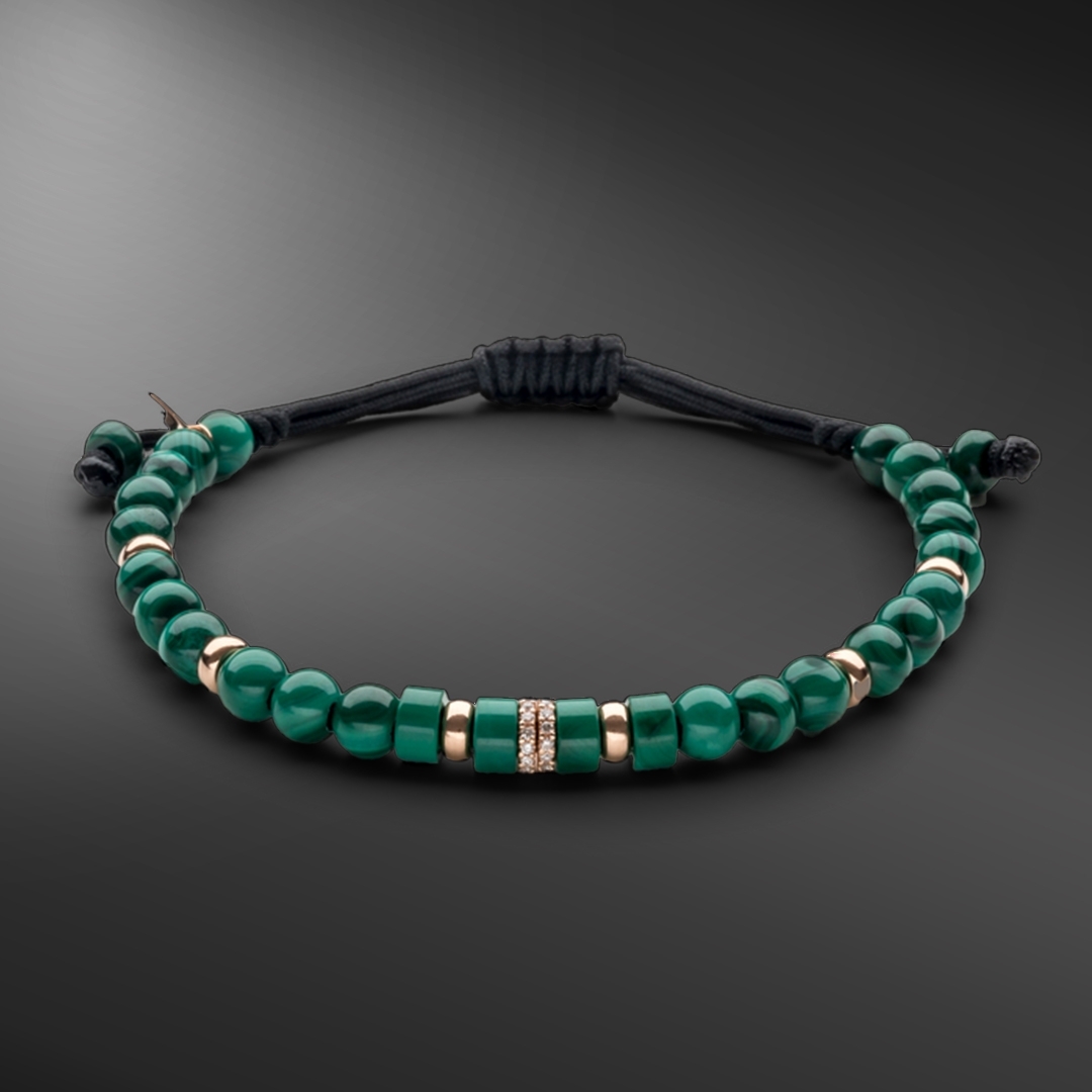 Byzylyk për meshkuj punuar në mënyrë artizanale në Flori 18K Rose Gold, gurë natyral Malachite, montuar me Diamantë të Bardhë ngjyrë G, pastërti VS si dhe rrip nautik Macrame.