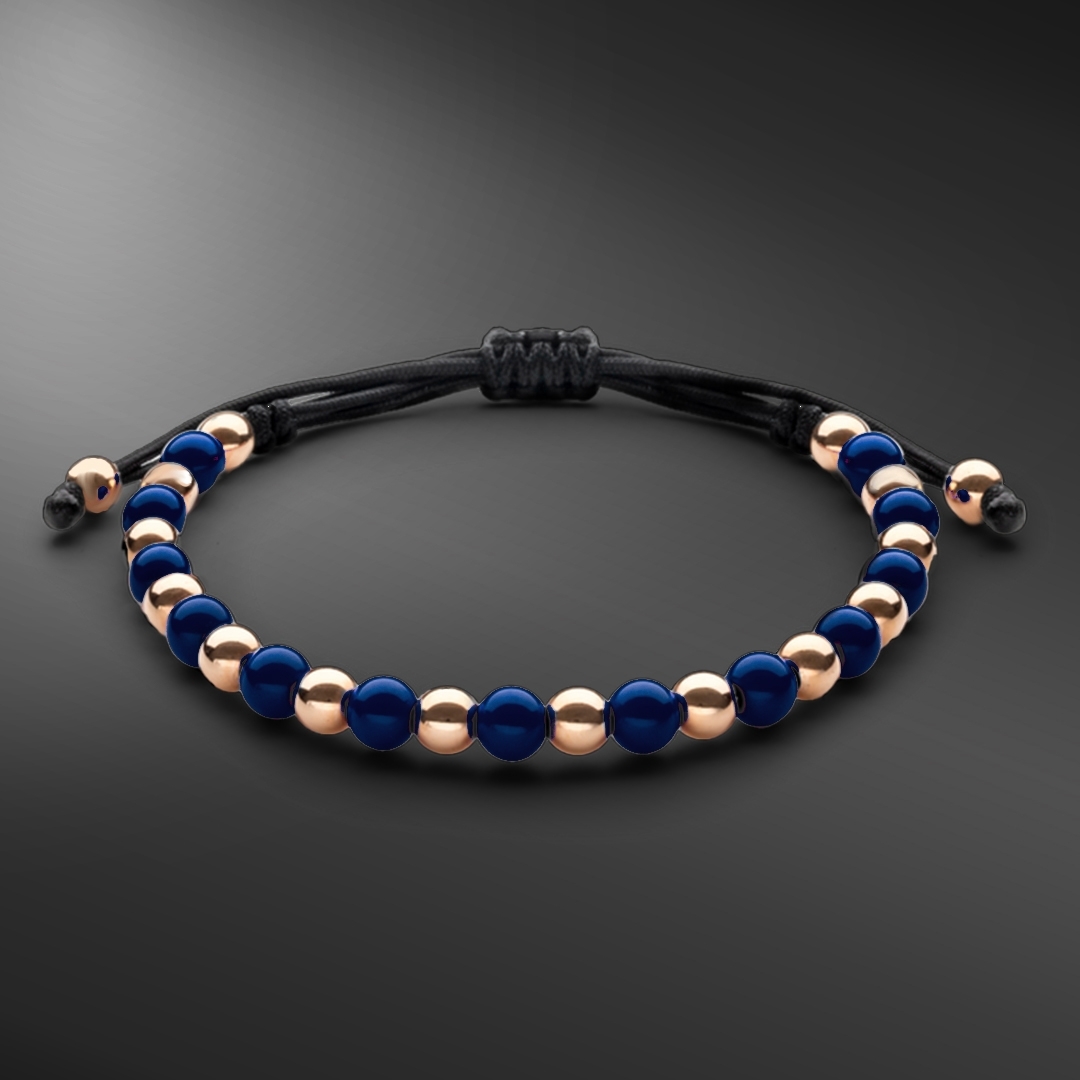 Byzylyk për meshkuj nga Jaibor, pjesë e koleksionit Wolf Small, e realizuar në gurë natyral Lapis Lazuli, flori të kuq 18 karat dhe rrip nautik Macrame.