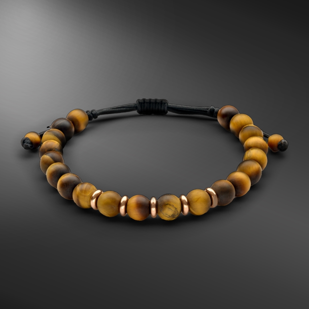 Byzylyk për meshkuj nga Jaibor, pjesë e koleksionit Wolf Large, e realizuar në gurë natyral Tiger's Eye, flori të kuq 18 karat dhe rrip nautik Macrame.