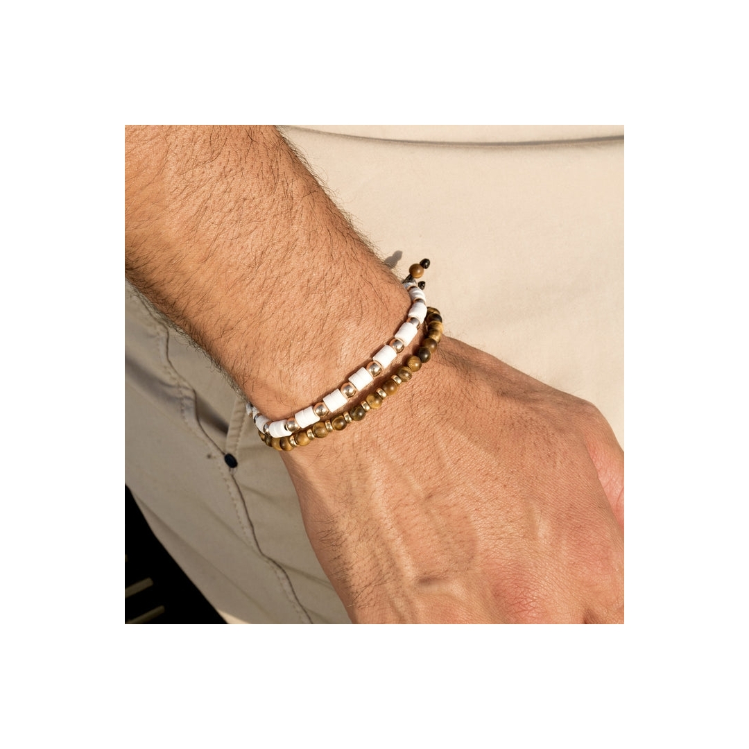 Byzylyk për meshkuj nga Jaibor, pjesë e koleksionit Wolf Small, e realizuar në gurë natyral Tiger's Eye, flori të kuq 18 karat dhe rrip nautik Macrame.