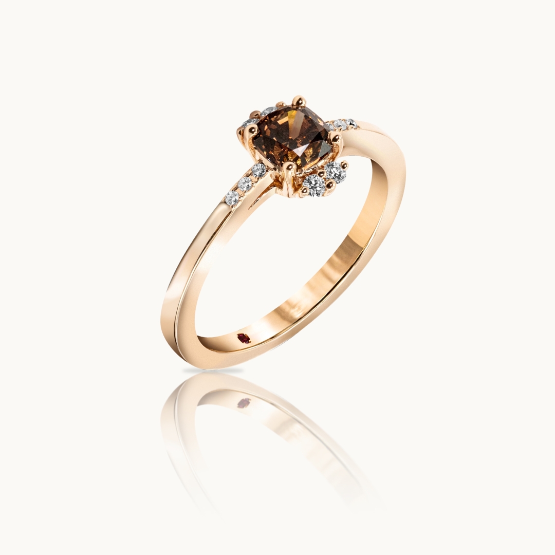 Unazë Fejese punuar në mënyrë artizanale në flori Rose Gold, montuar me një Diamant Natyral qëndror Brown në prerje Cushion 0.71ct pastërti VS si dhe me diamantë lateralë të bardhë 0.10ct ngjyrë F, pastërti VS. Çdo krijim i Rexha Gold mban brenda të montuar një rubin të fshehtë si simbol i standardit tonë. Masa 14.