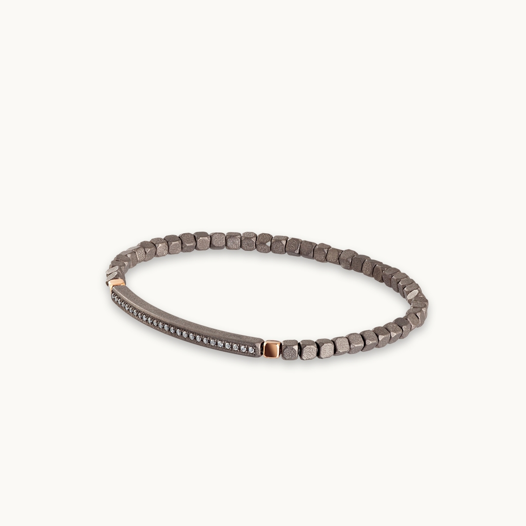 - Byzylyk për Meshkuj nga Mano J, pjesë e koleksionit Cuby, i punuar në mënyrë artizanale në titan gri me finiturë mat dhe flori të kuq 9 karat.