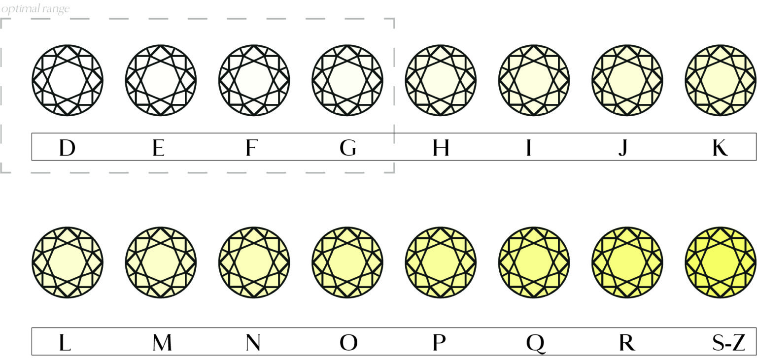Ndërsa udhëtojmë më thellë, arrijmë në mbretërinë e “ngjyrës”. Ngjyra e një guri të çmuar është zëri i tij dallues, duke shprehur emocione dhe histori përmes nuancës së tij. Kur flasim për ngjyrën e gurëve të çmuar, shpesh i referohemi mungesës së ngjyrës – gurët e çmuar pa ngjyrë, si diamantet, festohen për pastërtinë e tyre të pacenuar. Megjithatë, gurët e çmuar me ngjyra pikturojnë një pikurë që merr jetë, duke ju lejuar të zgjidhni një gur që përputhet me personalitetin dhe stilin tuaj. Në ilustrimin e mëposhtëm mund të shihni ndryshimin midis ngjyrave të ndryshme të një diamanti të bardhë.