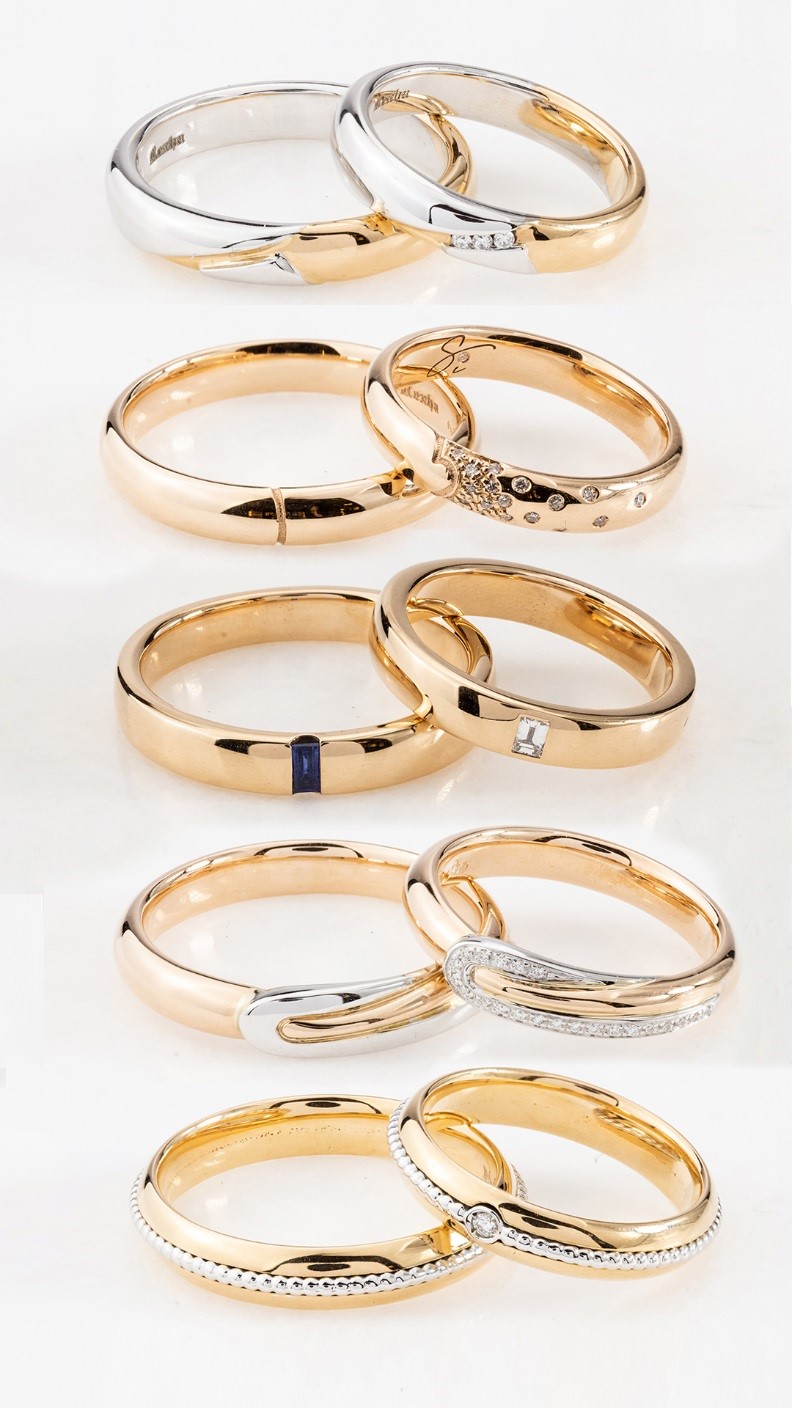 Për shembull, nëse keni një unazë fejese me diamant, merrni në konsideratë zgjedhjen e unazës së martese që komplimenton formën dhe stilin e unazës së fejesës. Një unazë e drejtë martese shoqërohet mirë me një unazë diamanti “solitaire”, ndërsa një unazë martese e lakuar është ideale për nje unaze me tre gurë ose në stil “halo”. Nëse dëshironi t’i shtoni shkëlqim shtesë bizhuterive tuaja të nusërisë, mund të merrni në konsideratë kombinimin e unazës suaj të martesës me një unazë diamanti “eternity” ose një varëse delikate diamanti.